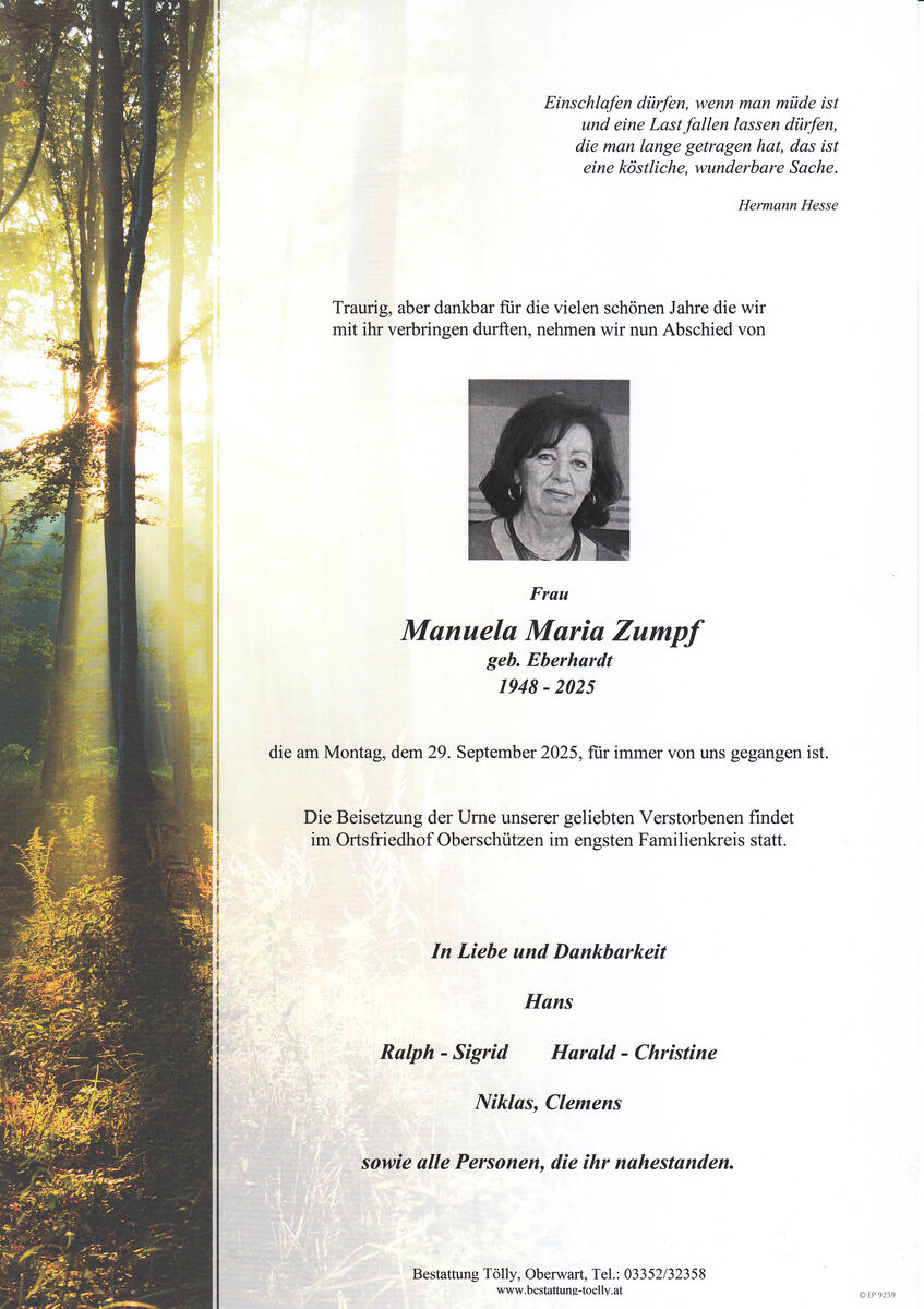 In lieber Erinnerung. Herzliches Beileid Sabine Petermann-Zumpf Reinhard Zumpf