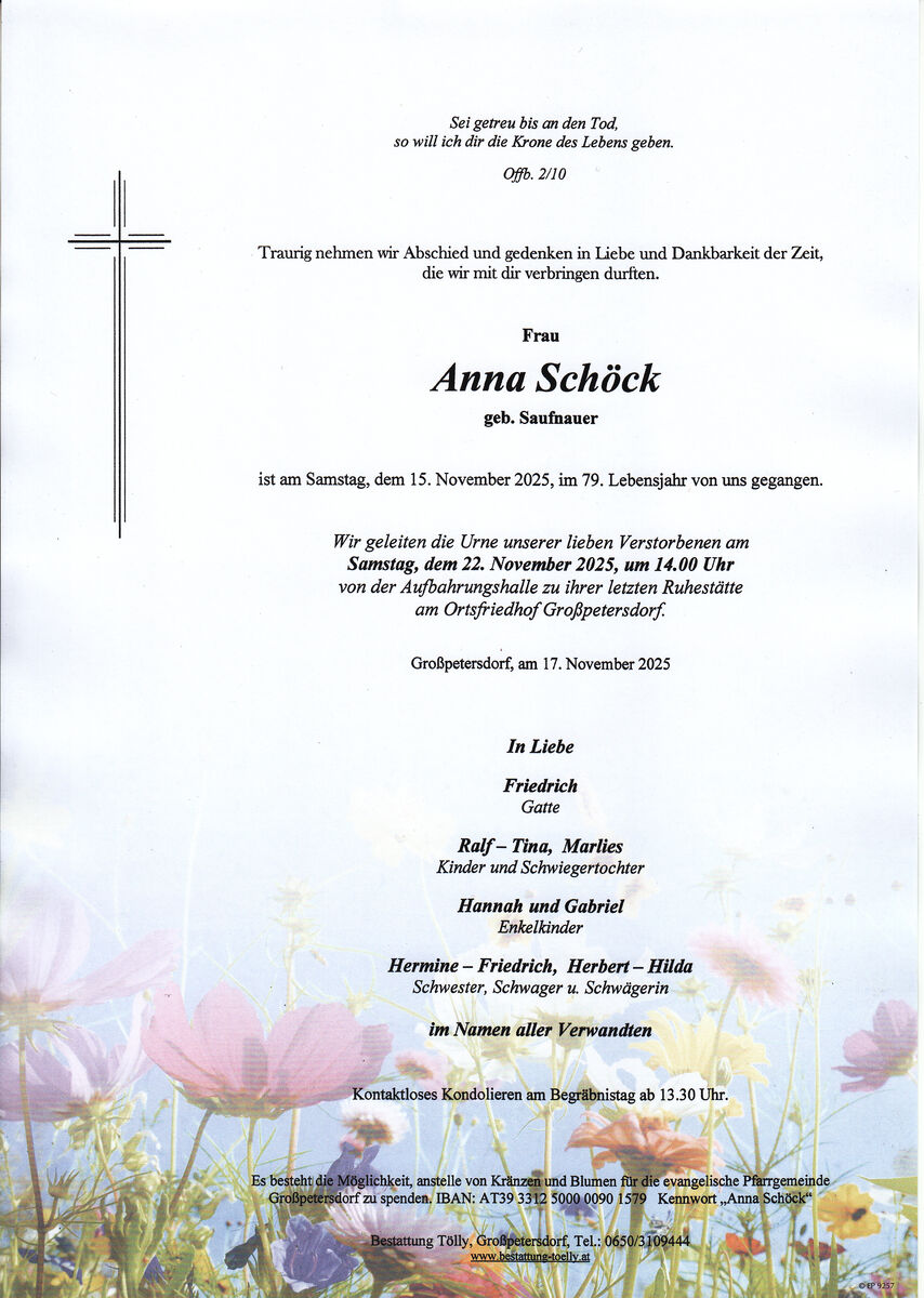 Liebe Anni Ein Licht auf Deine letzte Reise. Unser aufrichtiges Beileid der Familie. Gerti und Peter Bauer